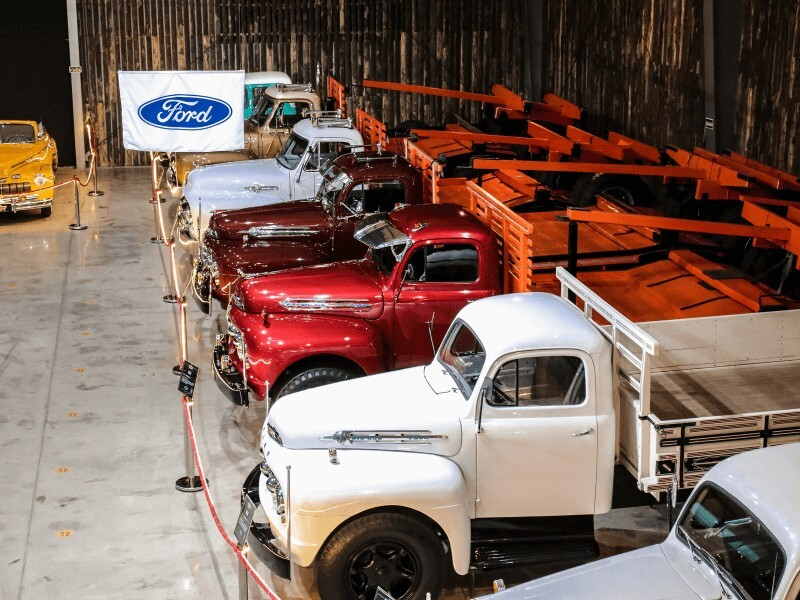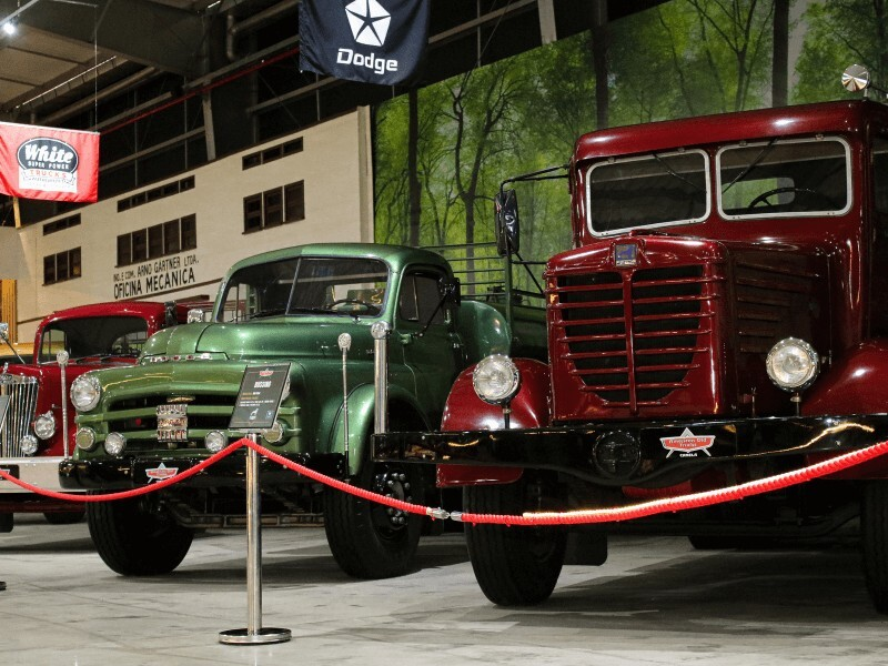 Acervo: Caminhões clássicos restaurados, com destaque para modelos das décadas de 1940 a 1970.